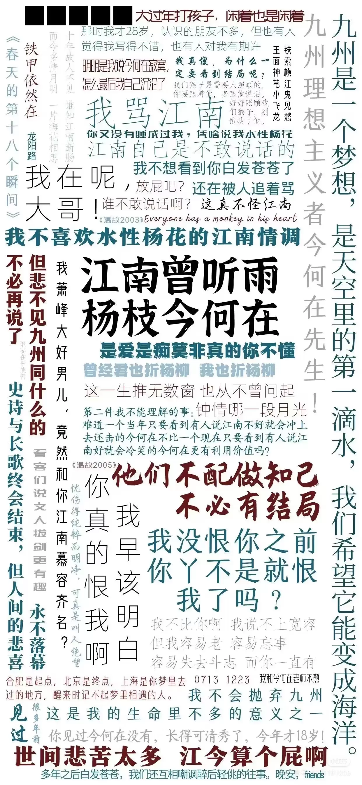 上回说到江南和今何在一起创建九州世界开创中国奇幻世界帝国一切都在欣欣向荣无人会觉得这一切会分崩离析那时候的他们俩意气风发 蜜月期的他们就连接受采访都是笑脸盈盈江南甚至会笑着说“你知道今何在吗,那时候的他可清秀了”也许下誓言“九州是天空里的第一滴水,我们希望它可以变成海洋” 可是真心易逝没有物质的爱情走两步就散了可是有物质也不一定坚固尤其是其中一个人压根不在乎钱的情况 九州幻想越办越好但是还是会遇到资金流出现问题的情况比如投资方撤资于是当这一情况出现的时候大家想着江南不是管着钱吗看看有多少收入大家可以用这笔钱度过危机可是大家提出这个要求的时候江南不仅拒绝被查迅速卷账本跑路还用公章在北京开了分公司这很明显就是背叛大家今何在相信他背叛了大家吗并没有 他怀着希望去北京想着江南可能是有什么难言之隐一定不是背叛只要话说开了就好可是到了北京江南闭门不见发消息不回这种故意回避的样子让今何在怒了于是发表着名文章《大雨天打孩子,闲着也是闲着》“我骂江南,江南是不敢说话的” 在帖子下江南回复“放屁吧?谁不敢说话啊?我在呢,大哥” “我不比你啊,我说不上宽容,但我容易老容易忘事,容易失去斗志,而你一直有” “你终于忍不住要蹦,你真的恨我啊,我早该明白!”瞧瞧,写文的就是不一样,就连回复都这么有文化这么好嗑,原来江南很早就知道今何在爱他了 骂战就此开启大家也都嗑起这一对当前明月曾经写下过“在中国历史上,共同创业的人大都逃不过“四同”的结局同舟共济——同床异梦——同室操戈——同归于尽”而今何在却在后面加了一同“许多年后,变同人小说。历史上无数死对头泪流满面”“但悲不见九州同” 今何在了解他理解他甚至他能原谅江南想要去创立新的公司只是不能原谅他一声不吭地抛弃掉过去的所有东西 不过爱情还是年轻的好哪怕分手互相在网上的对骂也充满着激情曾经有多爱现在就有多恨 每一句话恨不得把锋利的刀子往致命的地方捅鲜血淋漓但因为爱才知道怎么戳才最痛 没有原谅,没有心疼只有那种恨不得把对方弄死的心 就此以后今何在和江南也分道扬镳江南闭口不提今何在装作不熟试图让曾经在大众间淡忘做自己的作品 当然也成功了写下《龙族》以后自己晋升作家富豪榜名声大涨也疯狂开启自己的商业版图不过说句好笑的不知道是不是自己的坏事做的太多了导致自己的投资和创业做的一塌糊涂《九州志》办了30期就没了《龙文》我猜估计没几个人知道我从创刊号开始买,结果还没坚持多久就没了(眼看着龙文也有十年了)投资的电影游戏做一个死一个口碑爆炸烂到现在他的连载小说也没一个完结的《天之炽》西泽尔还在火车上坐着没回城呢《龙族》咱就是说要不然找一个代笔,你看看你现在写的什么东西《九州缥缈录》大概本人都忘了这有连载吧还有其他坑我都说都不想说《九州志》和《龙文》上连载作品未完结有多少不仅是自己的没完结导致签约的其他作者也没完结说着就是气还我十多年的喜欢! 当然我觉得江南是没有心的他写的少年是自己吗不一定吧是不是因为和今何在分道扬镳以后再也找不到他身上那股少年意气了呢说着喜欢学姐但是究竟是喜欢学姐还是对自己未能拥有的东西感到怀念呢“杨治今何在”当然他也会有所怀念在给《曾杨柳》作词的时候他将词牌名《折杨柳》将折改成了“曾”这到底是曾经的曾字还是今何在本名“曾雨”的“曾”字呢又或许两者都有所以会在自己的词中写下 “曾经君也折柳 我也折杨柳千万杨枝折尽后 走的人只留思念悠久” “我微笑向着你伸出手 说时光尽头 说不死不休恍惚又回初见时 却抚了斑驳甲胄” 他是否带有遗憾就不得而知了 只是在签名会的时候粉丝找他在书页上写下“江南曾听雨”的时刻他会思考后写下“杨治今何在”现在他们都老了没有过去的意气风发各自有各自的生活已经不是当年的他们 但是在他人问道“你知道今何在吗”他会不会想起曾经他们在一起的喜怒哀乐一起立下的誓言但已经没有可以道歉的契机只能说出“见过,在很多年以前” 接下来是我的一些碎碎念写五黑其实我是很纠结的因为这并不像宏迪一样宏迪是爱是撕心裂肺的痛每次嗑都会真情实感的落泪但是他们这一对很难评我嗑的时候只会愤怒愤怒在于江南的背叛在于江南的自私在于江南将自己作品用于商业完全没有文人风骨他作为作家也许作品是成功的但是作为商人是完完全全的失败我从龙族开始追我以为他是路明非是孤独的衰小孩我以为龙族那句献给所有的衰小孩其中包括我可是并不是我在难捱的学生阶段靠着他的作品度过那几年孤独的时光心里幻想着自己有朝一日能像路明非一样被所有人爱就连写文章都会有意无意的会像他一样江南真的是影响我很深刻的人 如果当年他们没有创立九州幻想没有资方投资或许凭借着热爱还能继续更新九州能磕磕绊绊把缥缈录更新完而不是腰斩如果没有相遇或许现在我们还能看到今何在意气风发的模样或许成长过后的他们没有利益纠葛的他们在相遇时能激动的拥抱在一起能够跟所有人说“看啊,这就是我的好兄弟”“这就是和我一起并肩作战的战友”“如果让我选择一个人我一定只会选择对方”而不是到后面的